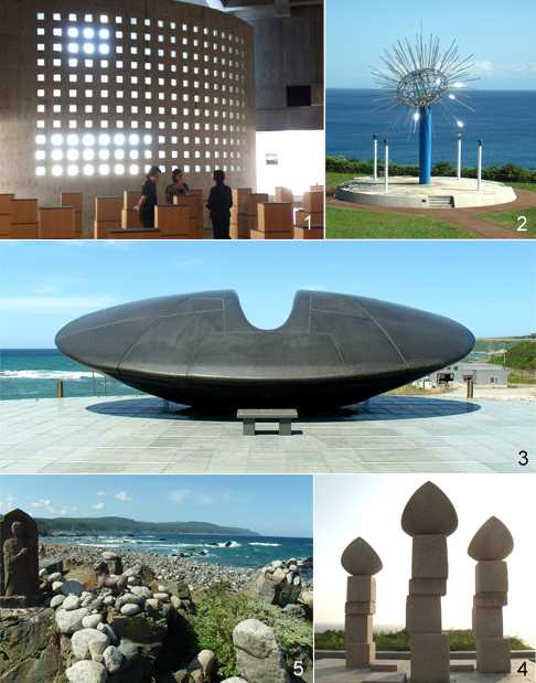 1 奥尻島津波館 2 うにまるモニュメント 3 時空翔 4 北追岬公園 5 賽の河原