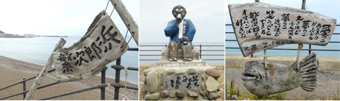 『道の駅 江差』の横に建つ繁次郎像。「江差の5月は江戸にもない」と言われたほど、活気と華やかさに満ちていた江戸時代に実在したと伝えられる繁次郎。大変とんちに長けていて、町中に笑いを振りまいたとか。