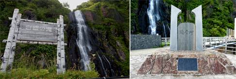 道道117号恵庭岳公園線で、えにわ湖側から走ると最初の滝が三段の滝。その名の通り、3段になって落下する美しい滝。紅葉の名所でもある。源義経が平泉の衣川館では死なず、奥州から蝦夷地に渡ったというのが義経北行伝説。