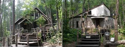 見本林の中には管理人の古い家と、赤い屋根のサイロと牛舎が建っていた。