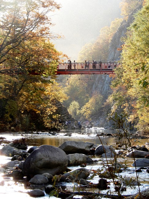 道道117号恵庭岳公園線で、えにわ湖側から走ると最初の滝が三段の滝。その名の通り、3段になって落下する美しい滝。紅葉の名所でもある。源義経が平泉の衣川館では死なず、奥州から蝦夷地に渡ったというのが義経北行伝説。