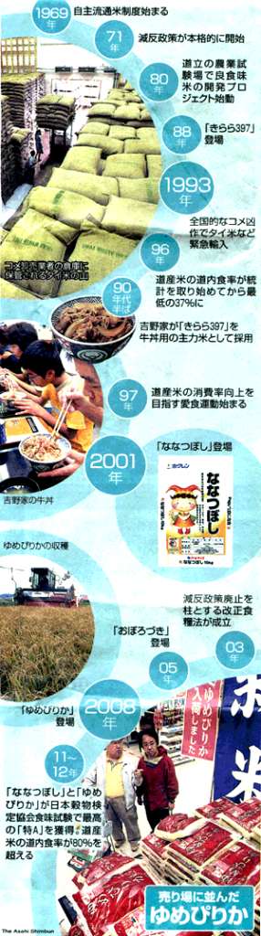 21世紀に入り、冷めてもおいしい「ななつぼし」の一般流通が始まり、道内食率は右肩上がりに上昇。道内食率は厳格な販売基準を定めた「ゆめぴりか」の普及によって2011年度に80%、12年度には90%を超えた。CMやコンビニ弁当への利用促進など、道が農業団体などと「オール北海道」で進めるPR戦略が実を結び、17年度も86%と高水準を保っている。